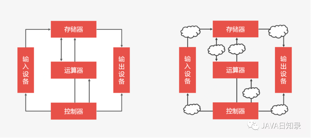 分布式系统看起来就像一个计算机。计算机包括五大体系结构(即冯诺依曼结构),它有五大部件:分别是控制器、运算器、存储器、输入及输出。你可以这么理解:一个分布式系统也包含这五大部件,其中最重要的是计算与存储。计算与存储由一系列网络节点组成,每个节点之间的通信就是输入与输出,各节点之间的调度管理就是控制器。