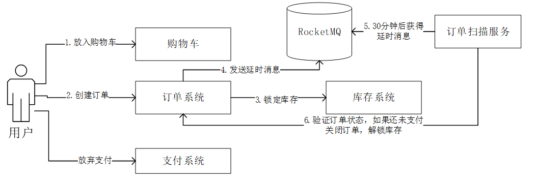 RocketMQ的延时消息可以做到这样的效果,订单系统发送一条消息,等30分钟后,这条消息才可以被消费者消费。所以我们引入延时消息后,就可以单独准备一个订单扫描服务,来消费延时消息,当它获得消息的时候再去验证订单是否已经支付,如果已经支付什么都不用做,如果还未支付就去进行关闭订单,解锁库存的操作。如图2所示: