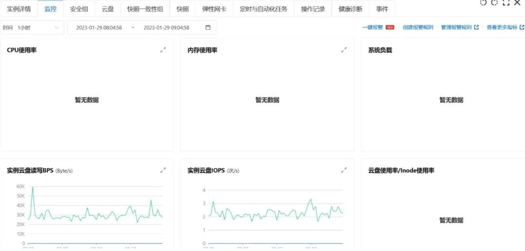 进阿里云控制台查看故障机器近期的各项指标,但是发现故障机器的指标有重要的几项丢失。内存使用率、CPU 使用率、系统负载均不显示。