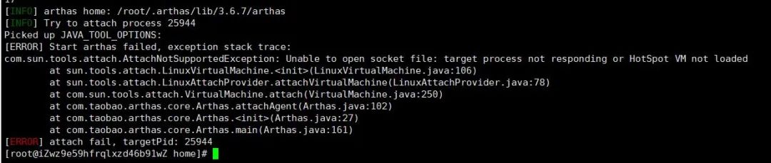 13. 确认服务器基础项没问题后,使用 arthas 查看服务进程堆栈情况,但是 arthas 无法进入进程。