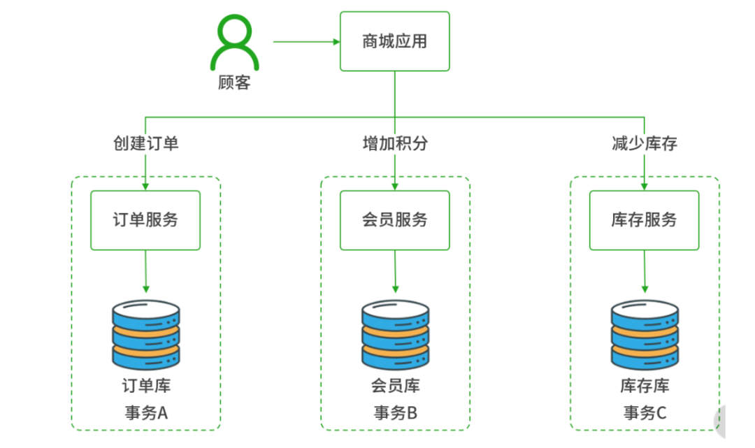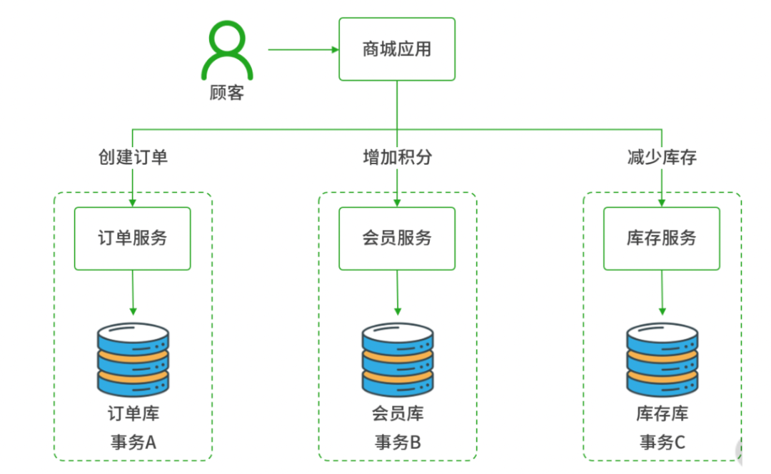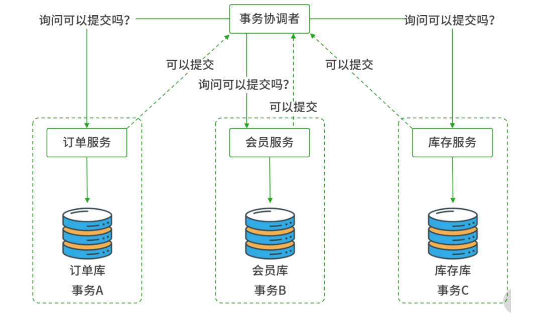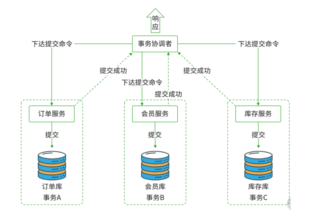 可以看到,商城应用作为业务的发起者分别向订单、会员、库存服务发起了调用,而这些服务又拥有自己独立的数据存储,因为在物理上各个数据库服务器都是独立的,每一个步骤的操作都会创建独立的事务,这就意味着在分布式处理时无法通过单点数据库利用一个事务保证数据的完整性,我们必须引入某种额外的机制来协调多个事务要么全部提交、要么全部回滚,以此保证数据的完整性,这便是“分布式事务”的由来。