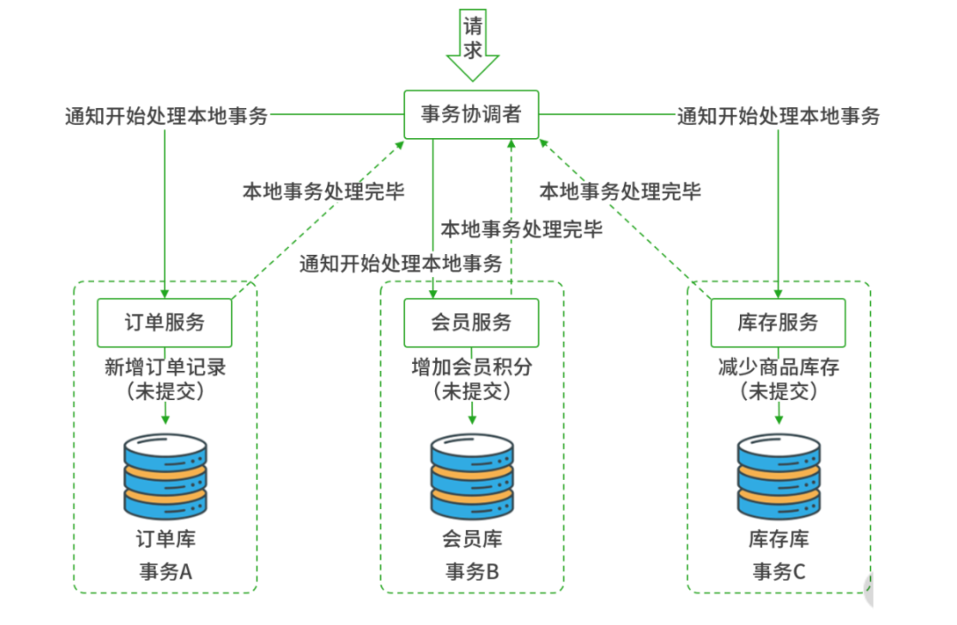 以上图为例,当商城应用订单创建后,首先事务协调者会向各服务下达“处理本地事务”的通知,所谓本地事务就是每个服务应该做的事情,如订单服务中负责创建新的订单记录;会员服务负责增加会员的积分;库存服务负责减少库存数量。在这个阶段,被操作的所有数据都处于未提交(uncommit)的状态,会被排它锁锁定。当本地事务都处理完成后,会通知事务协调者“本地事务处理完毕”。当事务协调者陆续收到订单、会员、库存服务的处理完毕通知后,便进入“阶段二:提交阶段”。