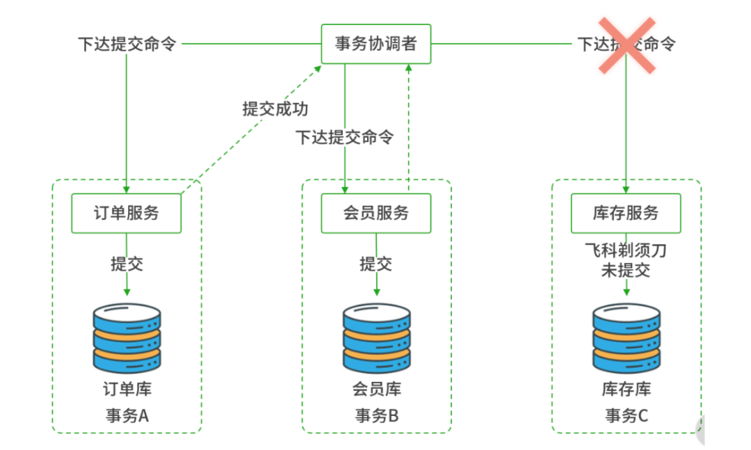 在提交阶段,事务协调者会向每一个服务下达提交命令,每个服务收到提交命令后在本地事务中对阶段一未提交的数据执行 Commit 提交以完成数据最终的写入,之后服务便向事务协调者上报“提交成功”的通知。当事务协调者收到所有服务“提交成功”的通知后,就意味着一次分布式事务处理已完成。