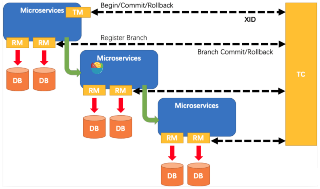 最后就是由Seata提供的Seata-Server中间件则提供事务协调者(TC)这个角色,实施全局事务1的提交、回滚命令下发。