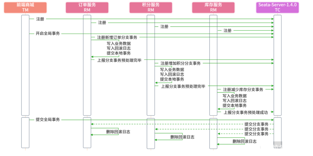 而与之对应的在订单服务中创建订单、会员服务中增加积分、库存服务减少库存这些实际产生的数据处理的服务模块,则被称为资源管理器(RM)。