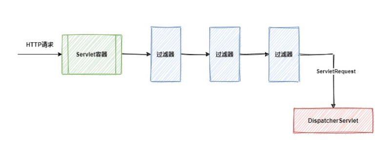一般而言,Web 请求处理机制都会使用“管道-过滤器(Pipe-Filter)”架构模式,而 Spring WebMVC 作为一种处理 Web 请求的典型实现方案,同样使用了 Servlet 中的过滤器链(FilterChain)来对请求进行拦截,如下图所示。