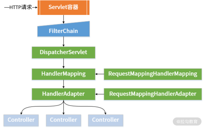 当 ServletRequest 通过过滤器链中所包含的一系列过滤器之后,最终就会到达作为前端控制器的 DispatcherServlet。DispatcherServlet 是 WebMVC 的核心组件,扩展了 Servlet 对象,并持有一组 HandlerMapping 和 HandlerAdapter。