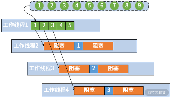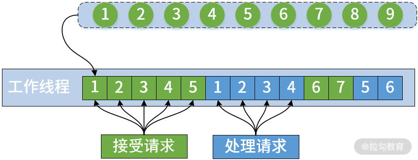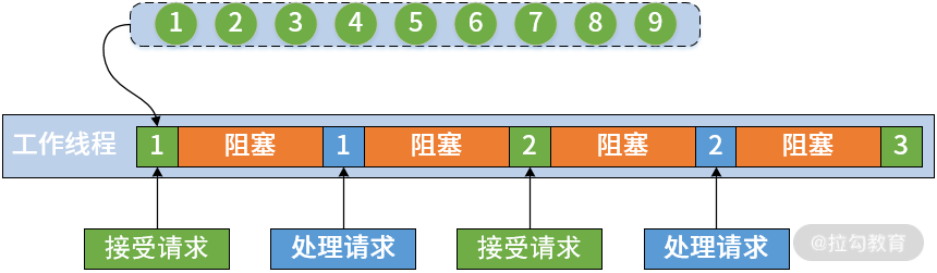 在前面的示例中,正如你可能注意到的,工作线程的实际处理时间远小于花费在阻塞操作上的时间。这意味着工作线程会被 I/O 读取或写入数据这一操作所阻塞。从这个简单的图中,我们可以得出结论,线程效率低下。同时,因为所有请求是排队的,相当于一个请求队列,所以接受请求和处理请求这两部分操作实际上是可以共享等待时间的。