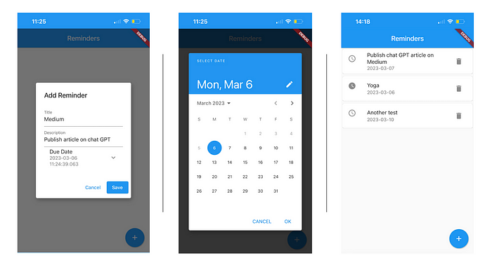 方法。点击按钮会显示了一个对话框,允许用户输入新的待办事项的标题、描述和到期日期。 当用户保存新的待办事项时,这条待办事项会添加到待办事项列表,然后组件会重建来更新待办事项列表。 最后,通过一个Reminder