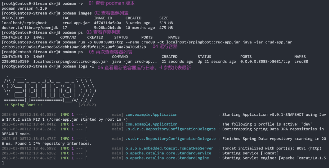 [root@Centos9-Stream dkr]# podman psCONTAINER ID IMAGE COMMAND CREATED STATUS PORTS NAMES920899cf9aad localhost/srpingboot:crud-app.jar java -jar crud-ap... 2 hours ago Up 2 hours ago 0.0.0.0:8082->8081/tcp crud