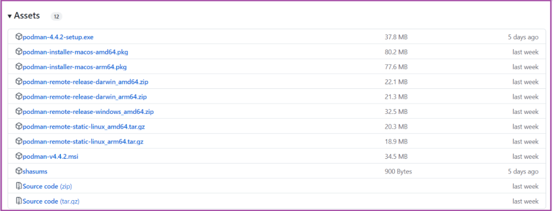 关于podman,支持Windows、MacOS与Linux发行版,可以前往github获取更多版本安装包(exe、zip、pkg、tar.gz、source),便于在网络隔离情况下部署。如果网络环境允许,可以使用操作系统支持的安装工具进行安装,比如RHEL系列使用yum或者dnf管理工具,Debian与Ubuntu使用apt工具。