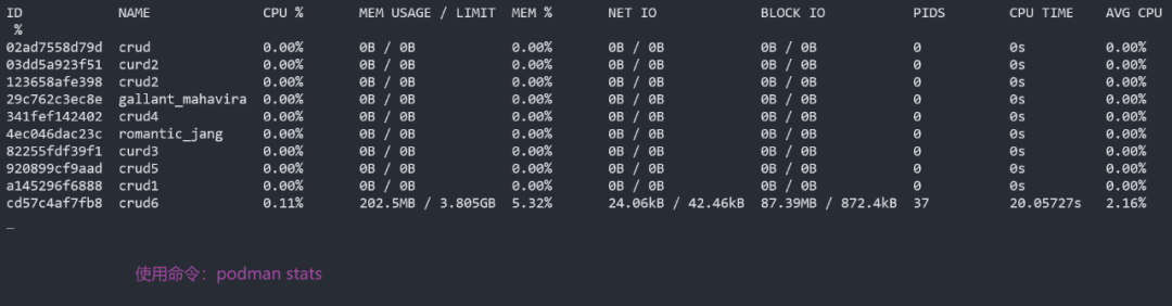 查看(监控)容器健康状态,主要分析CPU、内存负载:podman stats,使用ctrl + c 退出。如下图所示: