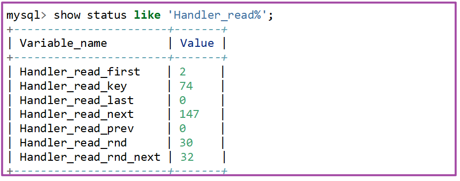 Handler_read_rnd_next:读取数据文件中下一行的请求数。如果要进行大量的表扫描,这个值就会很高。一般来说,这意味着您的表没有正确索引,或者说是写入查询没有利用到索引。