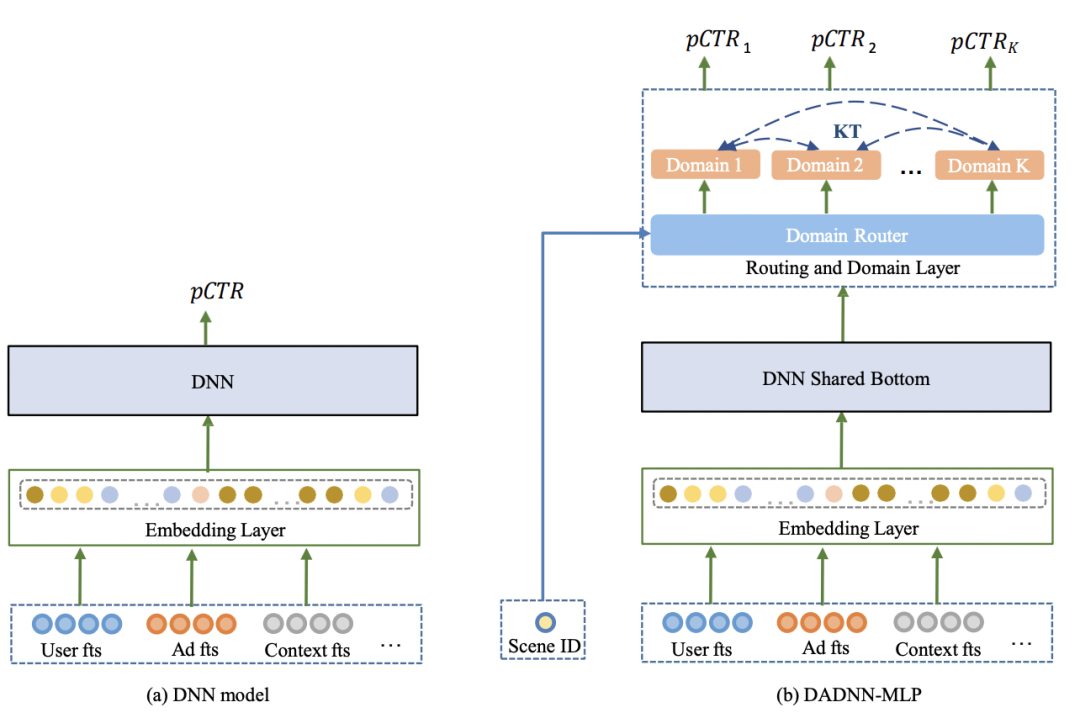 上图为模型结构展示(fts-features)。(a) DNN model,它仅会考虑单个场景 (b) DADNN-MLP model,它会进一步考虑对于每个单独场景裁减出的差异特性。routing layer会使用关于scene id的一个wide input来区分场景。KT表示在多个场景间的内部知识迁移(internal knowledge transfer) 。