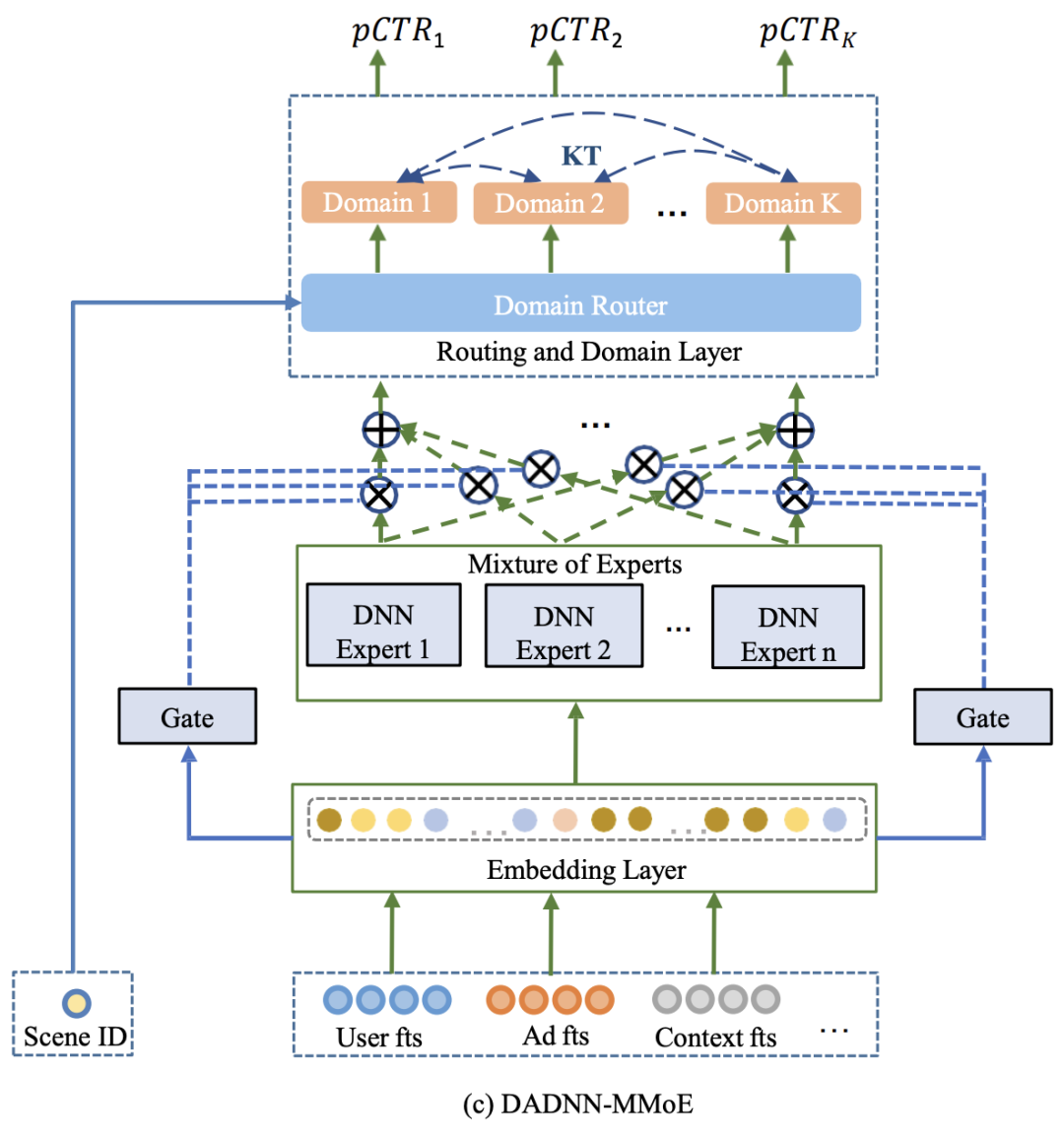 (c)DADNN-MMoE model,它引入了multi-gage mixture-of-experts来替换hard shared-bottom block。gate的weights允许为每个单独scene进行差异化representations。