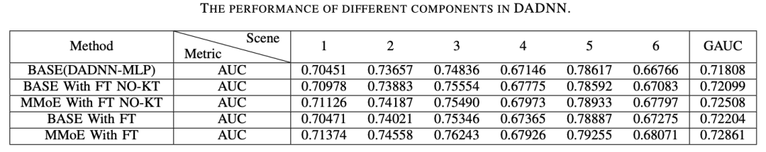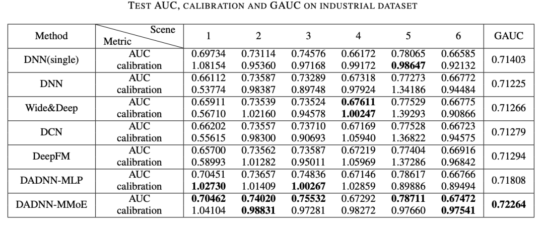 其中,weight是每个场景的曝光数。该metric会measures intra-scene order的好坏,并表明了在广告系统中的在线效果更相关。特别的,作者使用calibration metric来measure模块稳定性,因为CTR的accurate prediction对于在线广告的成功来说是必要的。它是average estimated CTR和empirical CTR之间的ratio: