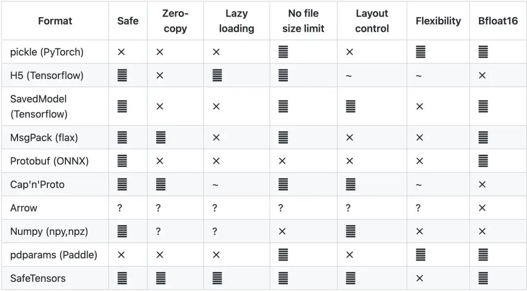 ● ckpt 是 pytoch 使用 pickle 序列化存储的格式,简单易用,但是会可能序列化某些 python 执行代码。
