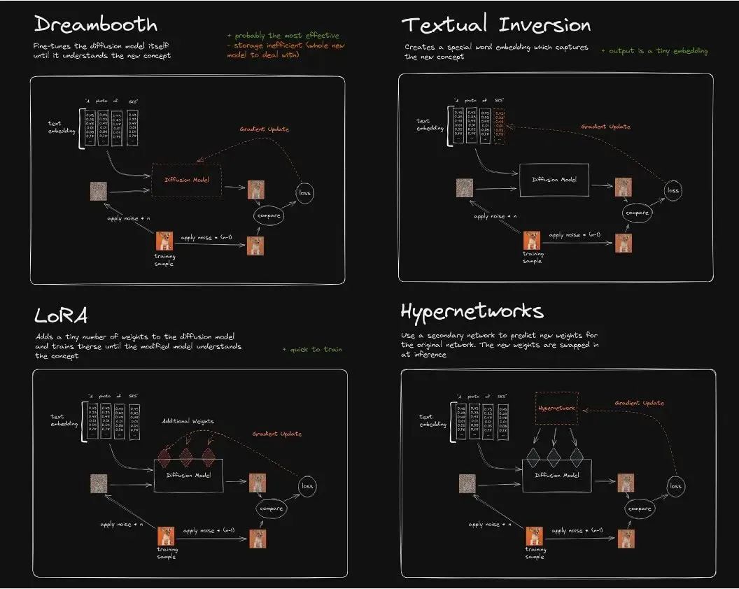 目前 Stable Diffusion 模型微调主要有4种方式:Dreambooth、LoRA (Low-Rank Adaptation of Large Language Models)、Textual Inversion、Hypernetworks。