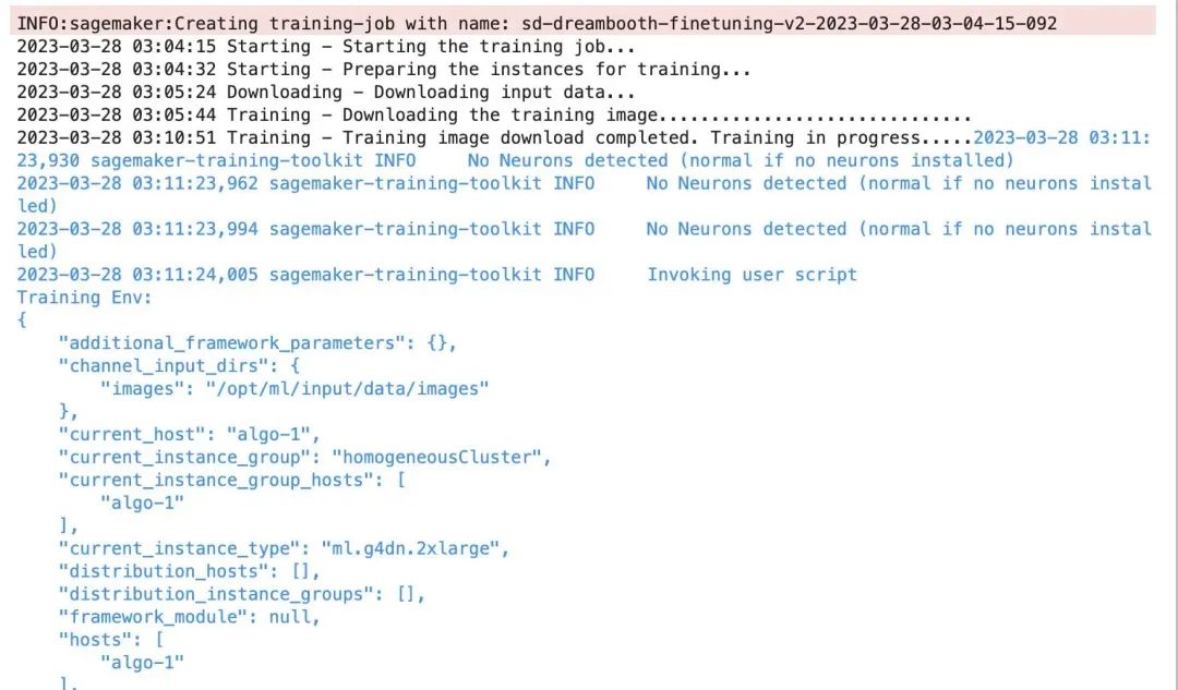 images_s3uri = 's3://{0}/dreambooth/images/'.format(bucket)inputs = {'images': images_s3uri}estimator = Estimator(role = role,instance_count=1,instance_type = instance_type,image_uri = image_uri,hyperparameters = hyperparameters,environment = environment)estimator.fit(inputs)