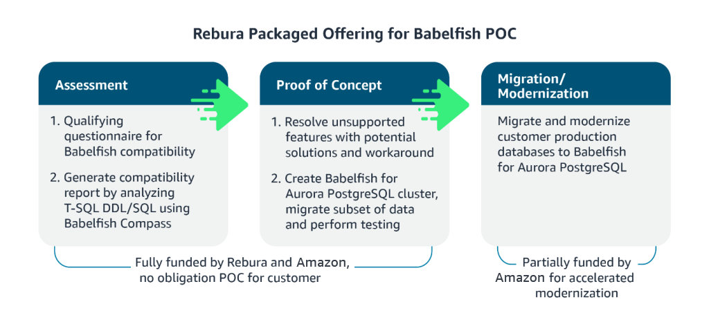 由 Amazon 和 Rebura 全额资助的我们的打包方案是一个数据库分析和概念验证解决方案,让客户评估 Babelfish 用作 Aurora PostgreSQL 的可行现代化路径。我们向客户展示如何通过完全资助、无义务的概念验证节省高达60%的本地运行成本。如果客户决定继续进行全面的现代化,Amazon 还可以提供额外的资金支持!