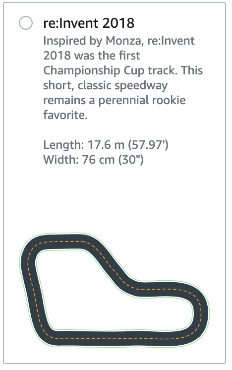 ● Amazon DeepRacer 车辆:1/18 比例的 RC 车辆,导入训练好的 Amazon DeepRacer 模型上运行推理用于自动驾驶。