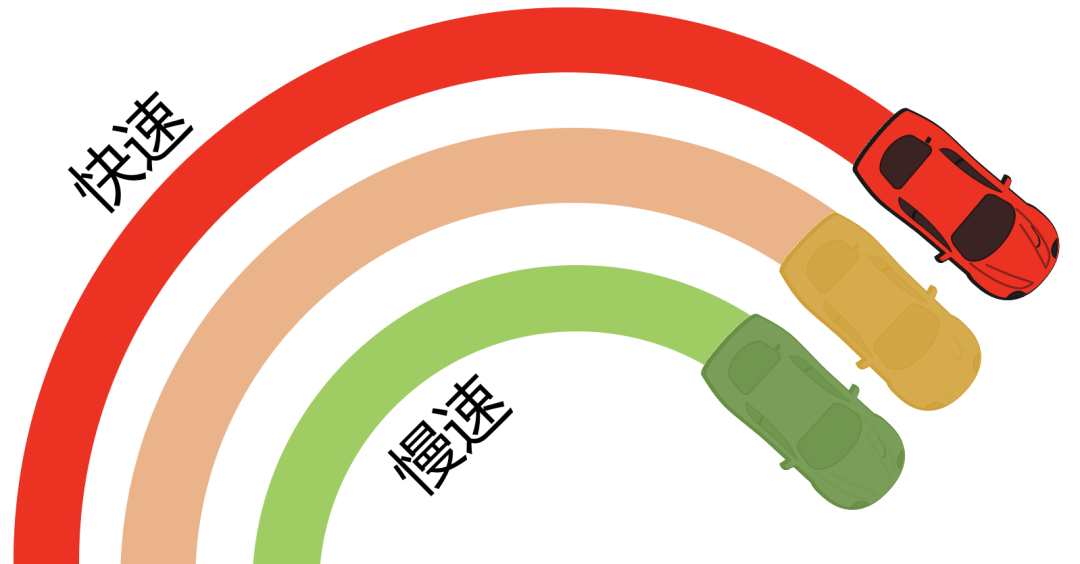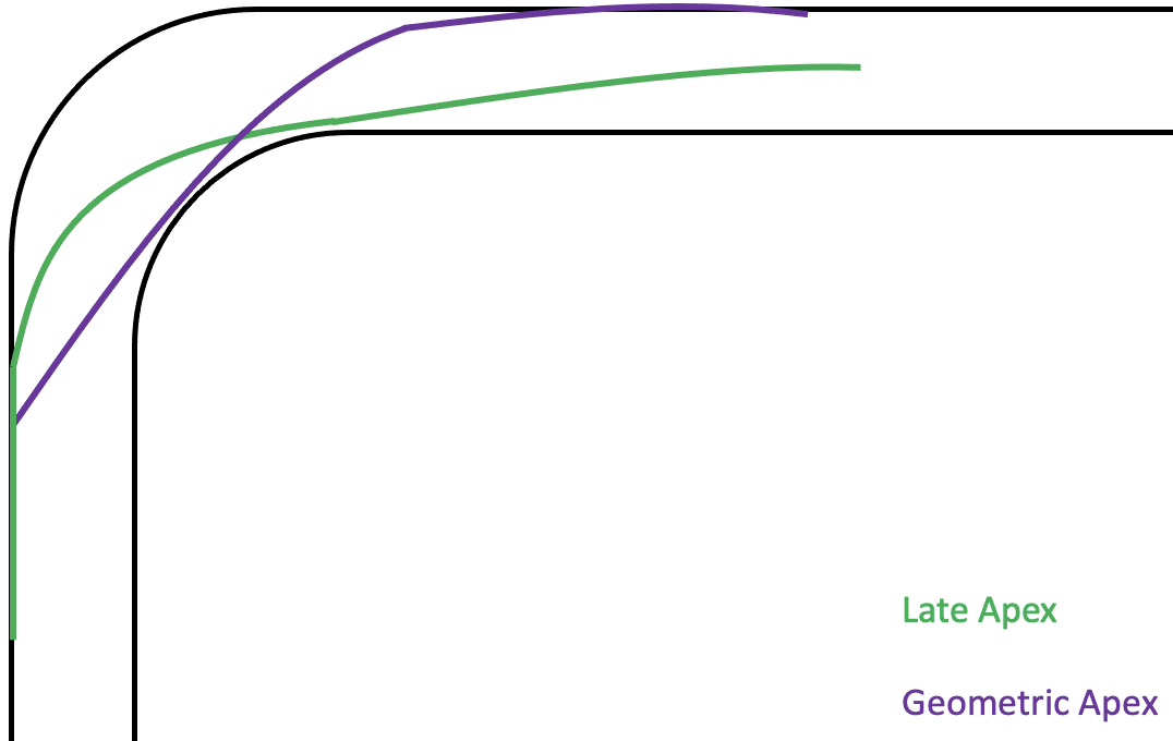 与我们直觉不同,实际比赛中的最优的过弯路线并非最近的路线,而是让赛车保持持续的动量的晚切弯。因为赛车在半径大的弧线上的速度能够比在半径小的弧线上更快,这也和赛车的侧向抓地力有关。