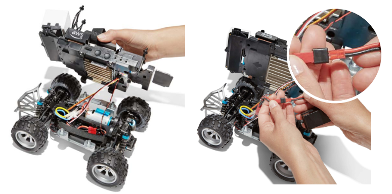● Amazon DeepRacer 车辆电池将会立即可用。将红色2针连接器重新连接到车辆传动系连接器,然后用魔术贴带将电池固定到车辆上。