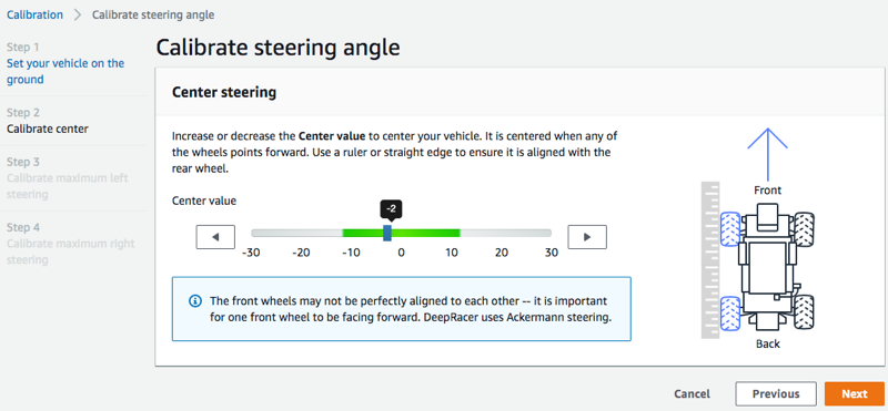 ● 配置 DeepRacer 的前进角度(center value),通过手动控制 DeepRacer 向前确定前进方向无误;