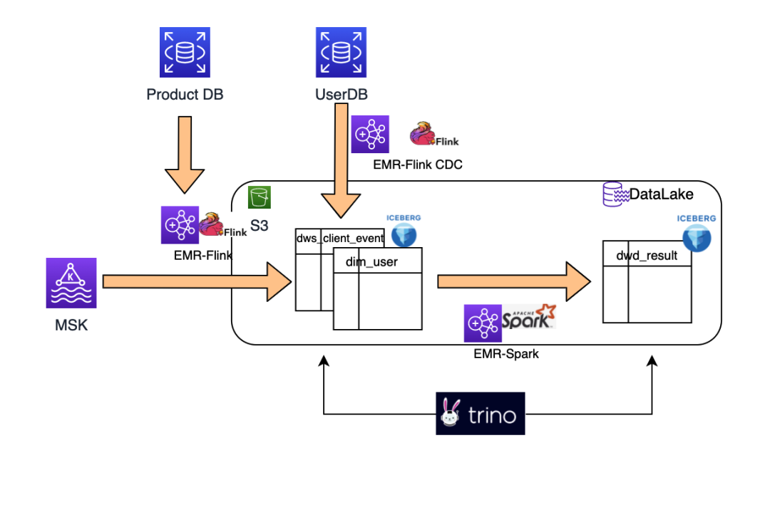 2.经过 EMR-Flink 清理数据和关联产品信息后存入 Iceberg 表。