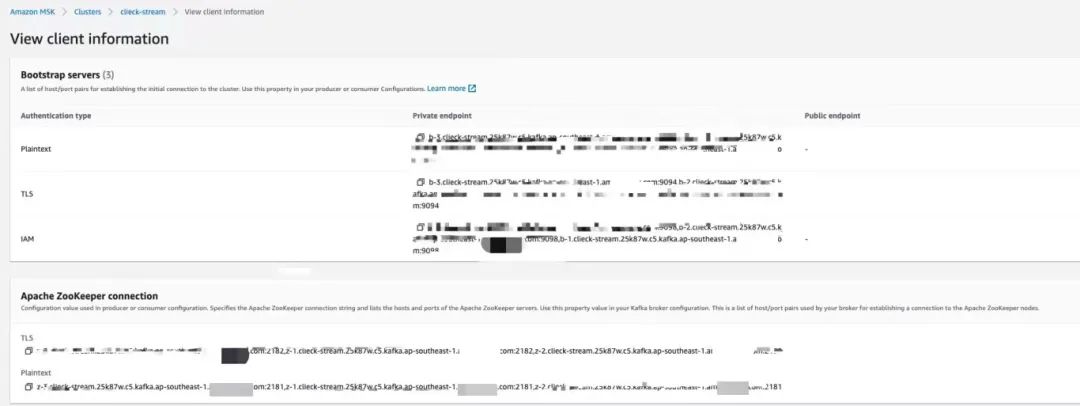 在 config 页面 Bootstrap servers endpoint 和 zookeeper connection,