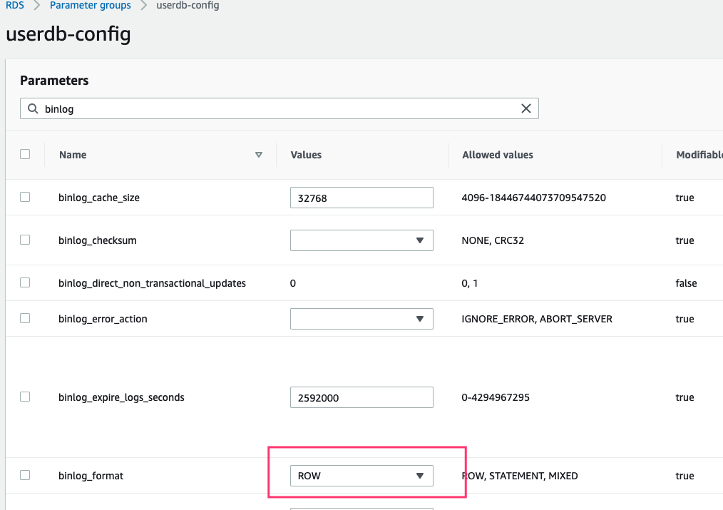 use catalog default_catalog;use default_database;CREATE TABLE default_database.user_member (`userid` STRING,`name` STRING,`show_params` STRING,`member_level` int,`update_time` TIMESTAMP(3),PRIMARY KEY (userid) NOT ENFORCED) WITH ('connector' = 'mysql-cdc','hostname' = 'user-database.crcwrov0yr1e.ap-southeast-1.rds.amazonaws.com','port' = '3306','username' = '{mysql_username}','password' = '{mysql_psw},'database-name' = 'user_db','table-name' = 'user_member');
