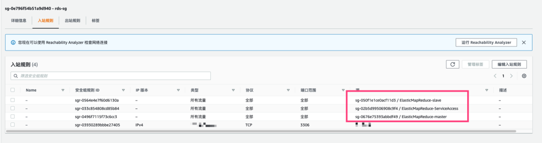 使其能访问 RDS,在 RDS 安全组添加 EMR master and slave 权限。