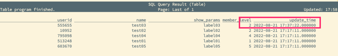 在 MySQL client 提交 “update user_member set member_level =2 where userid = '555655'”后,通过 FlinkSQL “select * from dim_db.user_member_sink;” 观察数据变化。