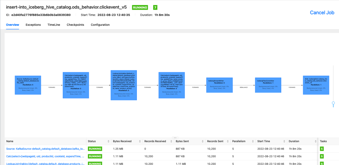public class Kafka2Iceberg {public static void main(String[] args) {StreamExecutionEnvironment env = StreamExecutionEnvironment.getExecutionEnvironment();env.disableOperatorChaining();env.setParallelism(5);StreamTableEnvironment tableEnv = StreamTableEnvironment.create(env);Configuration configuration = tableEnv.getConfig().getConfiguration();configuration.setInteger("table.exec.resource.default-parallelism", 5);configuration.setBoolean("table.dynamic-table-options.enabled", true);Properties properties = new Properties();properties.setProperty("max.partition.fetch.bytes", "10485760");properties.setProperty("request.timeout.ms", "120000");properties.setProperty("session.timeout.ms", "60000");properties.setProperty("heartbeat.interval.ms", "10000");env.enableCheckpointing(3000L, CheckpointingMode.EXACTLY_ONCE);env.getCheckpointConfig().setCheckpointStorage(FLINK_CHECKPOINT);String kafkasourceTable = "CREATE TABLE IF NOT EXISTS default_database.kafka_table (\n" +" `webpageId` int,\n" +" `uid` STRING,\n" +" `productId` STRING,\n" +" `cookieId` STRING,\n" +" `expendTime` int,\n" +" `updateTime` BIGINT,\n" +" `proctime` as PROCTIME(), -- 通过计算列产生一个处理时间列\n" +" `eventTime` AS TO_TIMESTAMP(FROM_UNIXTIME(updateTime/1000, 'yyyy-MM-dd HH:mm:ss')) -- 事件时间\n" +") WITH (\n" +" 'connector' = 'kafka',\n" +" 'topic' = '"+ DEFAULT_KAFKA_TOPIC +"',\n" +" 'properties.bootstrap.servers' = '"+ BOOTSTRAP_SERVERS_CONFIG +"',\n" +" 'properties.group.id' = 'test-group02',\n" +" 'scan.startup.mode' = 'earliest-offset',\n" +" 'format' = 'json'\n" +" )";String productsTable = "CREATE TABLE IF NOT EXISTS default_database.products_jdbc (\n" +" productId STRING PRIMARY KEY,\n" +" name STRING,\n" +" description STRING,\n" +" product_price DECIMAL(10, 4),\n" +" update_time TIMESTAMP(3)\n" +") WITH (\n" +" 'connector' = 'jdbc',\n" +" 'url' = '" + MYSQL_URL + "',\n" +" 'table-name' = 'products',\n" +" 'username' = '"+ MYSQL_USER + "',\n" +" 'password' = '"+ MYSQL_PSW +"',\n" +" 'scan.fetch-size' = '100',\n" +" 'lookup.cache.max-rows' = '5000',\n" +" 'lookup.cache.ttl' = '10s',\n" +" 'lookup.max-retries' = '3'\n" +" )" ;String flinkCatalogSQL = "create catalog iceberg_hive_catalog with(\n" +" 'type'='iceberg',\n" +" 'catalog-type'='hive',\n" +" 'clients'='5',\n" +" 'property-version'='1',\n" +" 'hive-conf-dir'='/usr/lib/hive/conf',\n" +" 'warehouse'='s3://sg-emr-flink-iceberg/mywarehouse/'\n" +")";String clickEventTable = "create table IF NOT EXISTS ods_behavior.clickevent_v5(\n" +" `webpageId` int,\n" +" `uid` STRING,\n" +" `productId` STRING,\n" +" `cookieId` STRING,\n" +" `expendTime` int,\n" +" `updateTime` TIMESTAMP(3),\n" +" `name` STRING,\n" +" `product_price` DECIMAL(10, 4),\n" +" `dt` STRING,\n" +" `eventTime` TIMESTAMP(3)\n" +") PARTITIONED BY (dt) with(\n" +" 'type'='iceberg',\n" +" 'catalog-type'='hive',\n" +" 'write.metadata.delete-after-commit.enabled'='true',\n" +" 'write.metadata.previous-versions-max'='5',\n" +" 'sink.parallelism' = '5',\n" +" 'sink.partition-commit.policy.kind'='metastore,success-file', \n" +" 'warehouse'='s3://sg-emr-flink-iceberg/mywarehouse/',\n" +" 'write.upsert.enable'='true',\n" +" 'format-version'='2'\n" +")";String insertETL = "insert into ods_behavior.clickevent_v5(\n" +" webpageId,\n" +" uid,\n" +" productId,\n" +" cookieId,\n" +" expendTime,\n" +" updateTime,\n" +" name,\n" +" product_price,\n" +" eventTime,\n" +" dt\n" +") select\n" +" aa.webpageId,\n" +" aa.uid,\n" +" aa.productId,\n" +" aa.cookieId,\n" +" aa.expendTime,\n" +" aa.updateTime,\n" +" bb.name,\n" +" bb.product_price,\n" +" aa.eventTime,\n" +" DATE_FORMAT(LOCALTIMESTAMP, 'yyyyMMdd')\n" +"from\n" +" default_catalog.default_database.kafka_table AS aa\n" +" left join default_catalog.default_database.products_jdbc FOR SYSTEM_TIME AS OF aa.proctime AS bb\n" +" on aa.productId = bb.productId";tableEnv.executeSql(kafkasourceTable);tableEnv.executeSql(productsTable);tableEnv.executeSql(flinkCatalogSQL);tableEnv.useCatalog("iceberg_hive_catalog");tableEnv.executeSql("CREATE DATABASE IF NOT EXISTS ods_behavior");tableEnv.executeSql(clickEventTable);tableEnv.executeSql(insertETL);}}