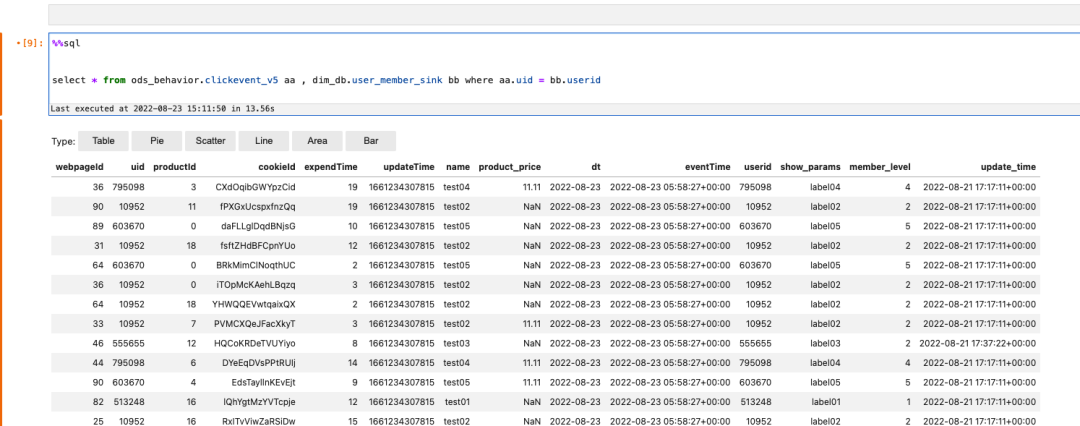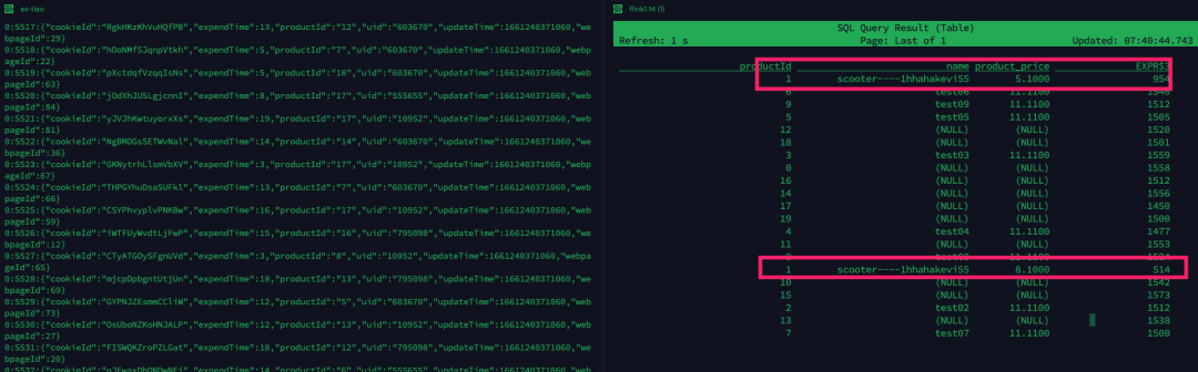 selectproductId,name,product_price,count(uid)fromods_behavior.clickevent_v5 /*+ OPTIONS('streaming'='true', 'monitor-interval'='1s')*/group byproductId,name,product_price