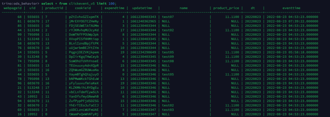 trino-cli --catalog icebergtrino> use iceberg;trino> use catalog iceberg;trino> show Schemas;、trino> use ods_behavior;trino:ods_behavior> select * from clickevent_v5 limit 100;