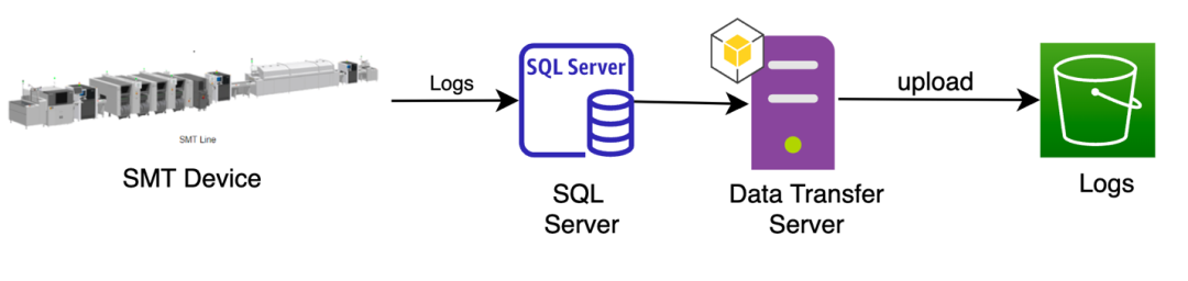 SMT 设备在日常操作中会生成日志,并将其存储在工厂的本地 SQL Server 中。数据传输服务器从 SQL 服务器获取包括错误代码数据/事件数据等信息的日志并上传到 Amazon S3。