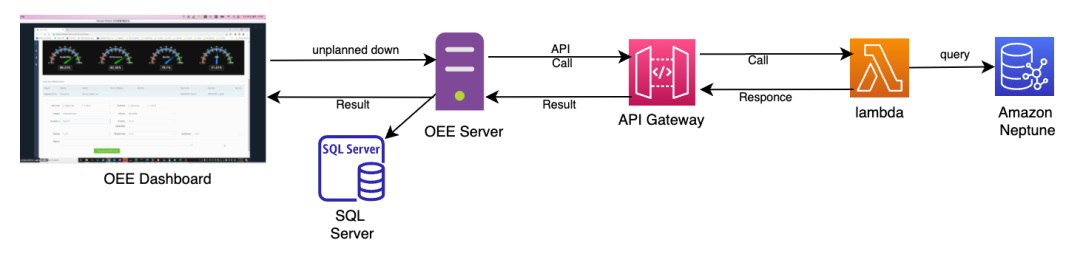 ● OEE 系统根据计划外停机事件触发对Amazon API 网关的 API 调用。API 网关会触发 Amazon Lambda 查询 Neptune 数据,找出对应 Module、Module part 和 Root cause 的错误码,然后返回给 OEE 系统。