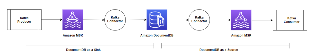 在这两个使用案例中,您可以使用 Kafka 连接器将更改流从 Amazon DocumentDB 移至 Amazon MSK。
