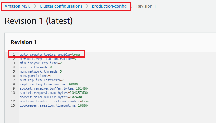• 使用 auto.create.topics.enable=true 创建自定义配置。以下屏幕截图显示名为 production-config 的自定义配置示例。