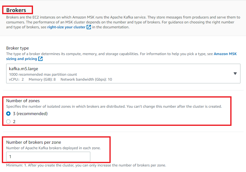 • 在配置 Amazon MSK 集群时创建三个代理(最少),如以下屏幕截图中所示。