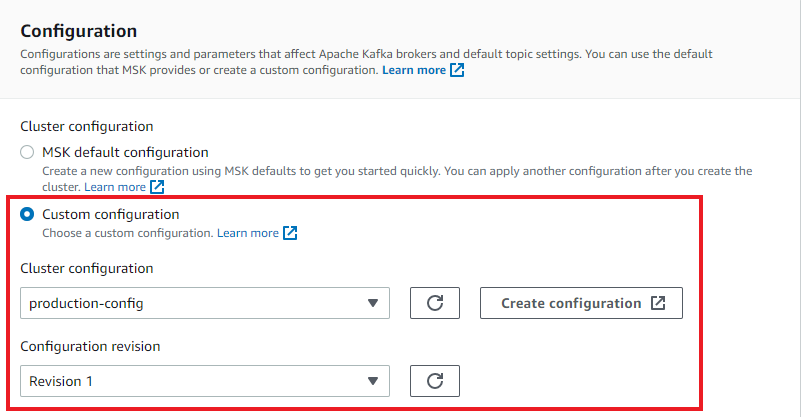 • 在 Amazon MSK 集群配置期间使用自定义配置。