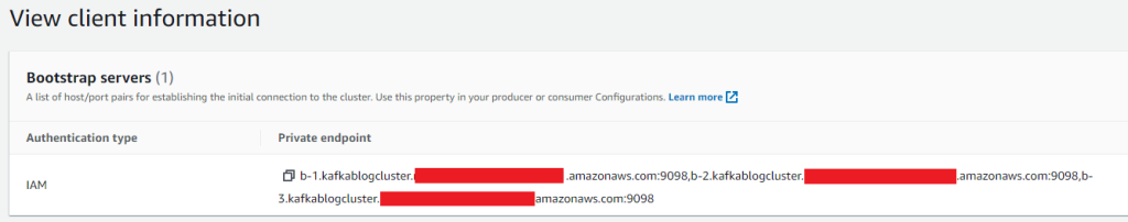 4、复制 Amazon MSK 引导服务器的私有端点。