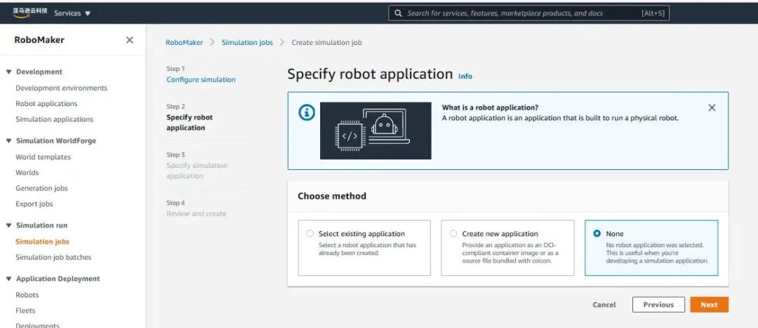 在 Specify robot application (指定机器人应用程序) 屏幕上,为机器人应用程序选择 None (无),然后选择 Next (下一步) 继续。