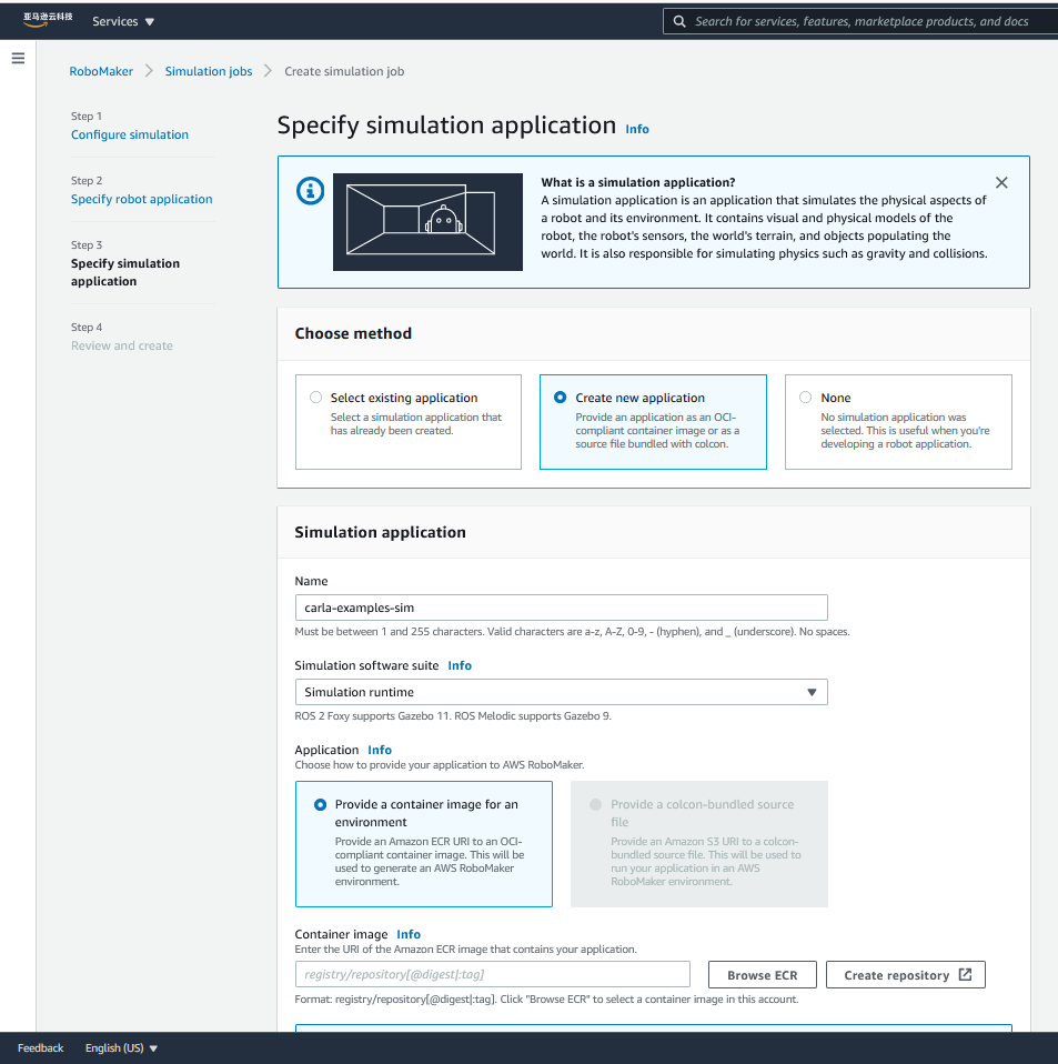 将应用程序命名为“carla-examples-sim”,然后选择 Simulation runtime (模拟运行时) 作为模拟软件套件。