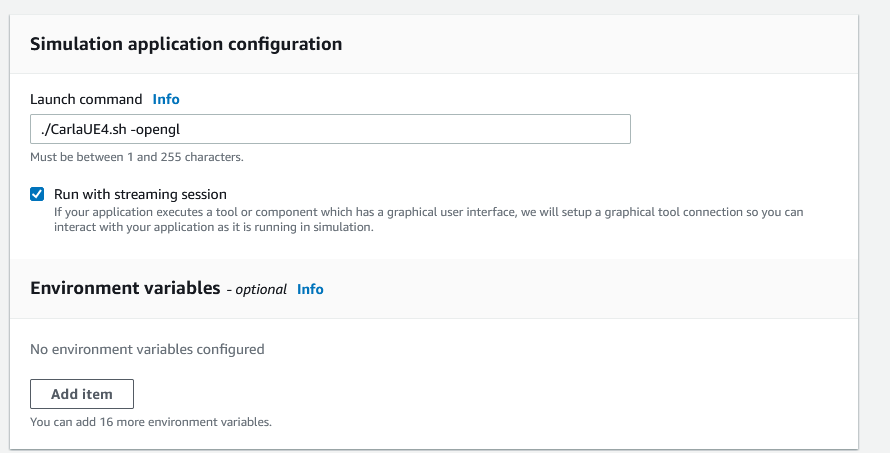 对于 Launch command (启动命令),请使用“./CarlaUE4.sh -opengl”,然后选中 Run with streaming session (使用流媒体会话运行) 旁边的复选框。