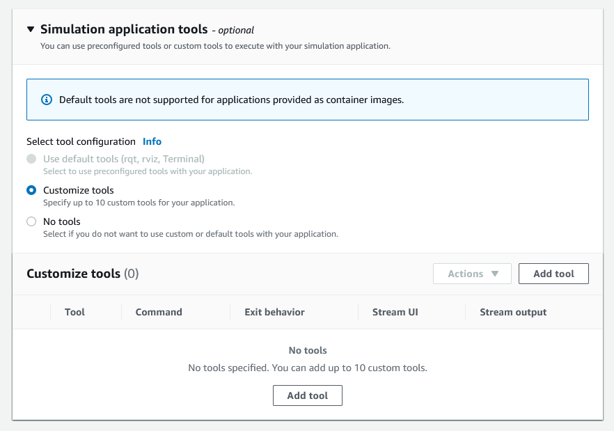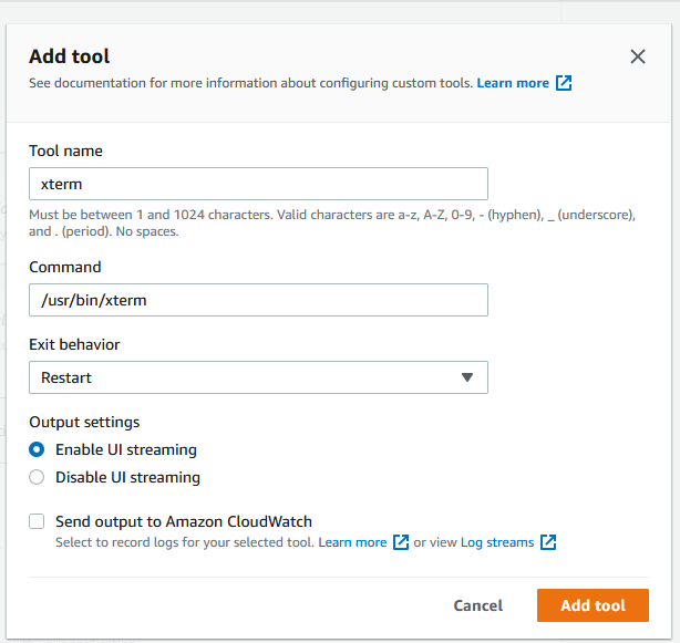 在 Exit behavior (退出行为) 列表中选择 Restart (重新启动),并在 Output Settings (输出设置) 中选择 Enable UI streaming (启用 UI 流式传输)。然后选择 Add tool (添加工具) 按钮继续。