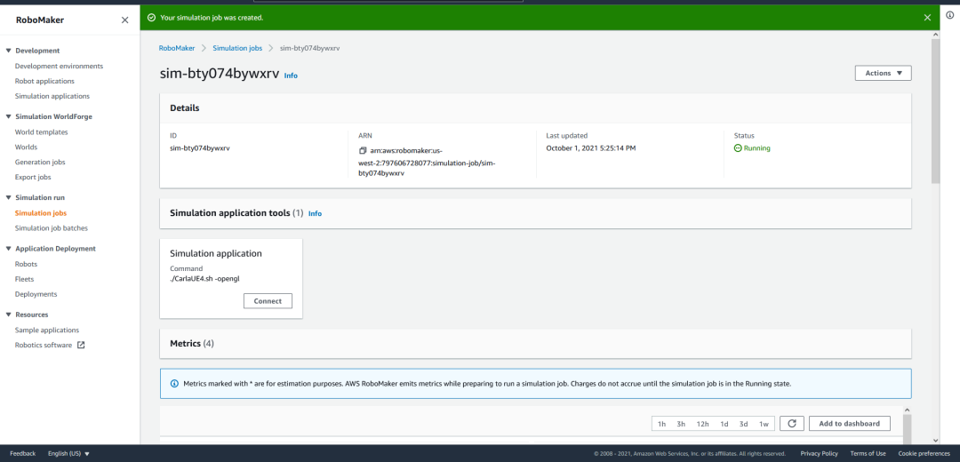 启动这项作业需要几分钟时间。创建作业后,单击 Simulation application (模拟应用程序) 上的 Connect (连接) 按钮查看模拟。