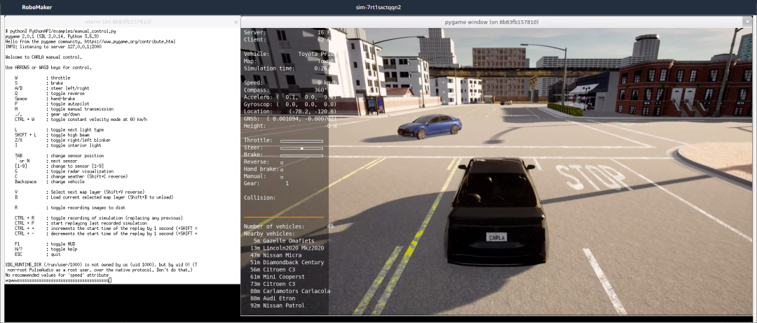 此时将出现一个新窗口,其中有一辆汽车准备行驶。拖动窗口并调整大小,使它们并排放置。使用键盘操控汽车;“w”是加速,“a”是左转,“d”是右转,“s”是刹车。