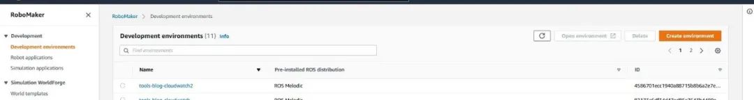 开始学习本教程时,我们将创建一个 Amazon RoboMaker 集成式开发环境(IDE)。在 Amazon RoboMaker 菜单中,选择 Development Environments (开发环境),然后选择 Create environment (创建环境)。